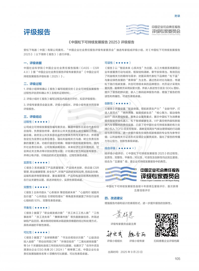 在表现形式上,《报告》融合丰富案例、利益相关方真实证言、严谨数据与创新设计,为中国松下的可持续发展实践提供了有力实证与直观呈现。封面整体采用代表松下品牌的“松下蓝”与象征绿色使命的“青草绿”为主色,通过色彩对比与融合,传递松下践行低碳发展、共创可持续未来的品牌理念;同时融入现代化的松下办公楼、员工活动与创新产品的大幅视觉图,全面呈现松下作为行业领军者的企业形象,并进一步彰显以创新智慧科技回应大众美好需求的初心与用心。《报告》连续十年获得中国企业社会责任报告评级专家委员会“五星级”(卓越)评价,本次报告更首次获得“五星佳级”(典范)最高评价。